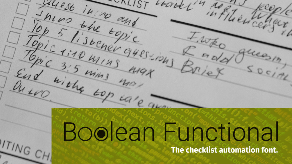 A font to help designers easily implement checkboxes via document automation and data variation on Adobe Illustrator, InDesign, Microsoft Word, or any other place a regular font would work. Using the font is very easy. Download and install it on your computer, select the data or fields you need checkboxes, and apply the font. Boolean Functional works out of the box with most common data types like (T) true or (F) false, (Y) yes or (N) no, and (0) zero and (1) ones.